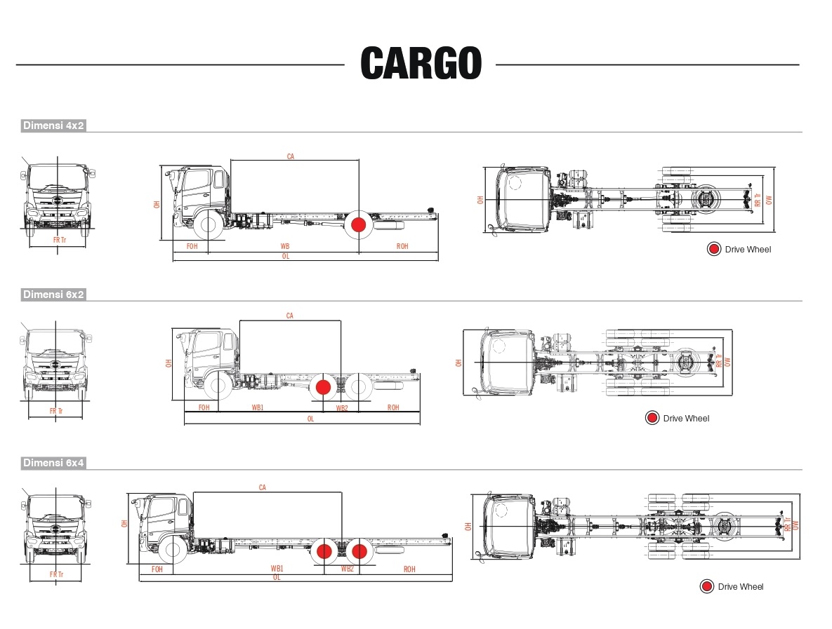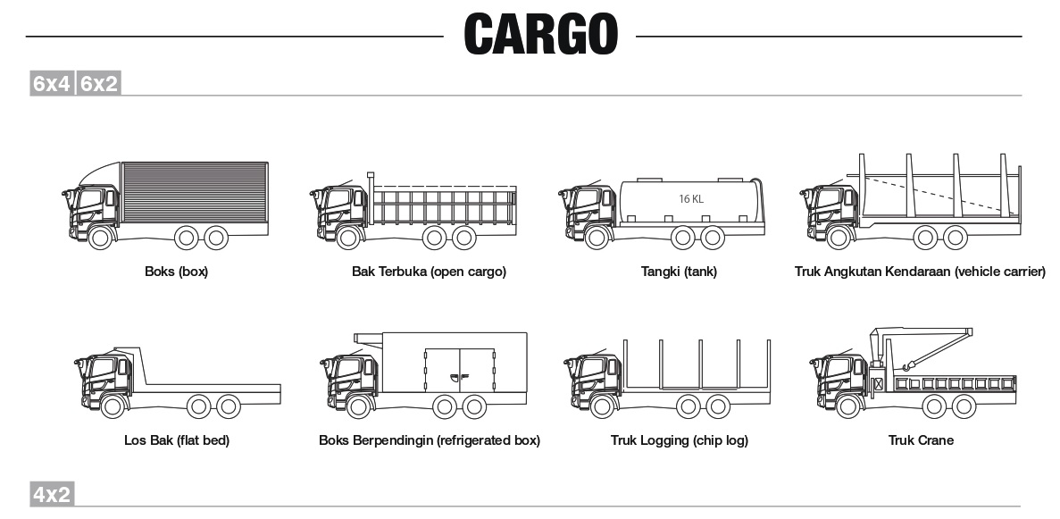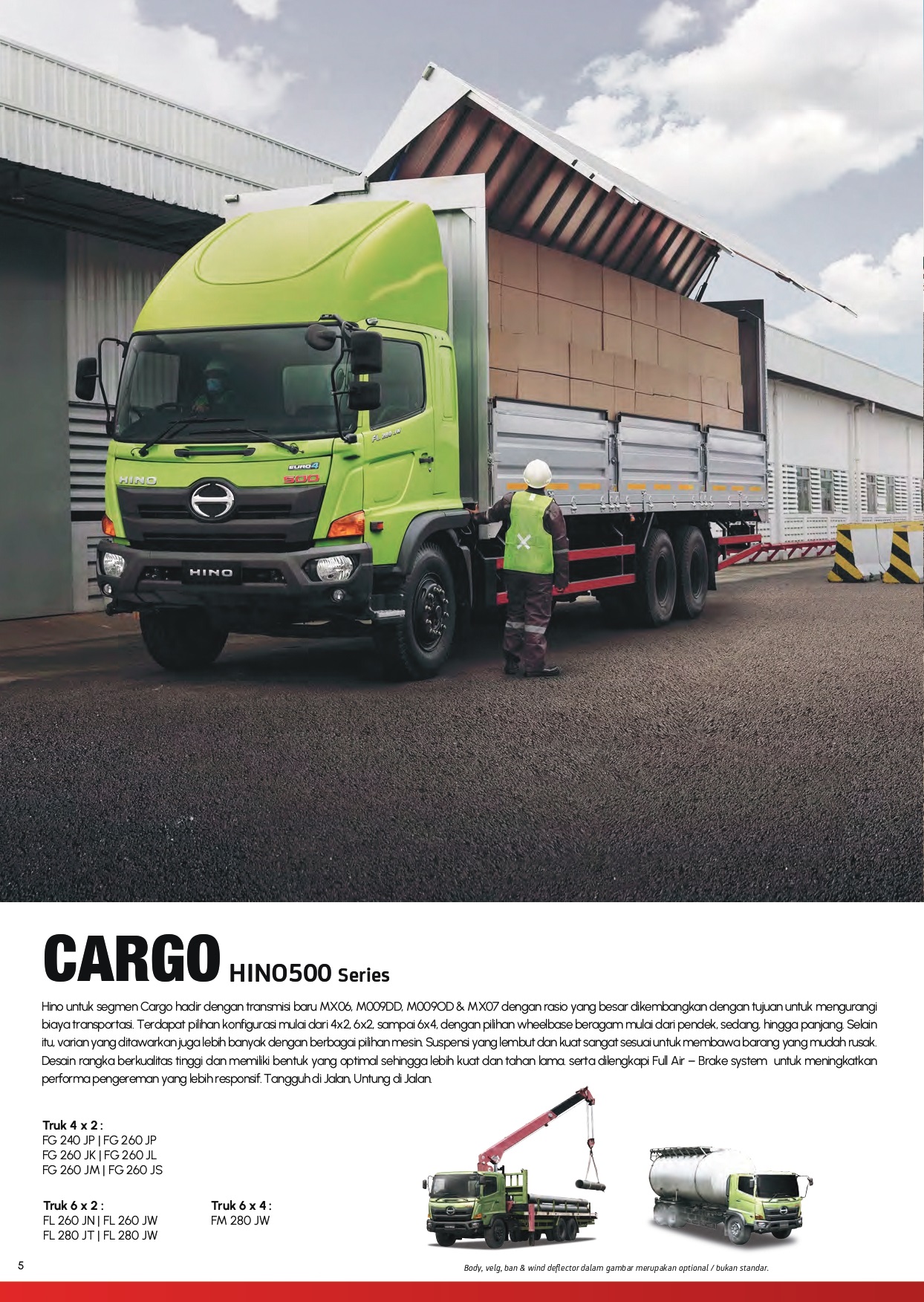 Hino untuk segmen Cargo hadir dengan transmisi baru MX06, MX09DD, MX09QD & MX07 dengan rasio yang besar dikembangkan dengan tujuan untuk mengurangi biaya transportasi. Terdapat pilihan konfigurasi mulai dari 4×2, 6×2, sampai 6×4, dengan pilihan wheelbase beragam mulai dari pendek, sedang, hingga panjang. Selain itu, varian yang ditawarkan juga lebih banyak dengan berbagai pilihan mesin. Suspensi yang lembut dan kuat sangat sesuai untuk membawa barang yang mudah rusak. Desain rangka berkualitas tinggi dan memiliki bentuk yang optimal sehingga lebih kuat dan tahan lama serta dilengkapi Full Air – Brake system untuk meningkatkan performa pengereman yang lebih responsif. Tangguh di Jalan. Untung di Jalan.