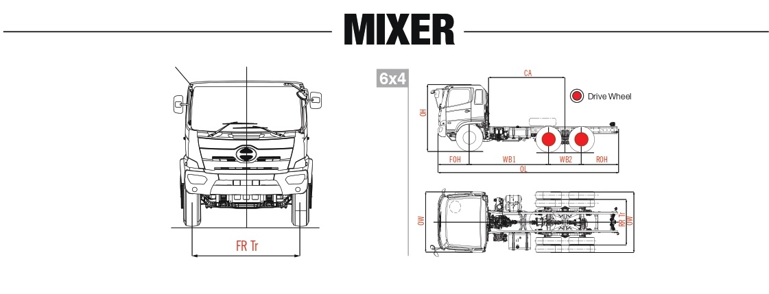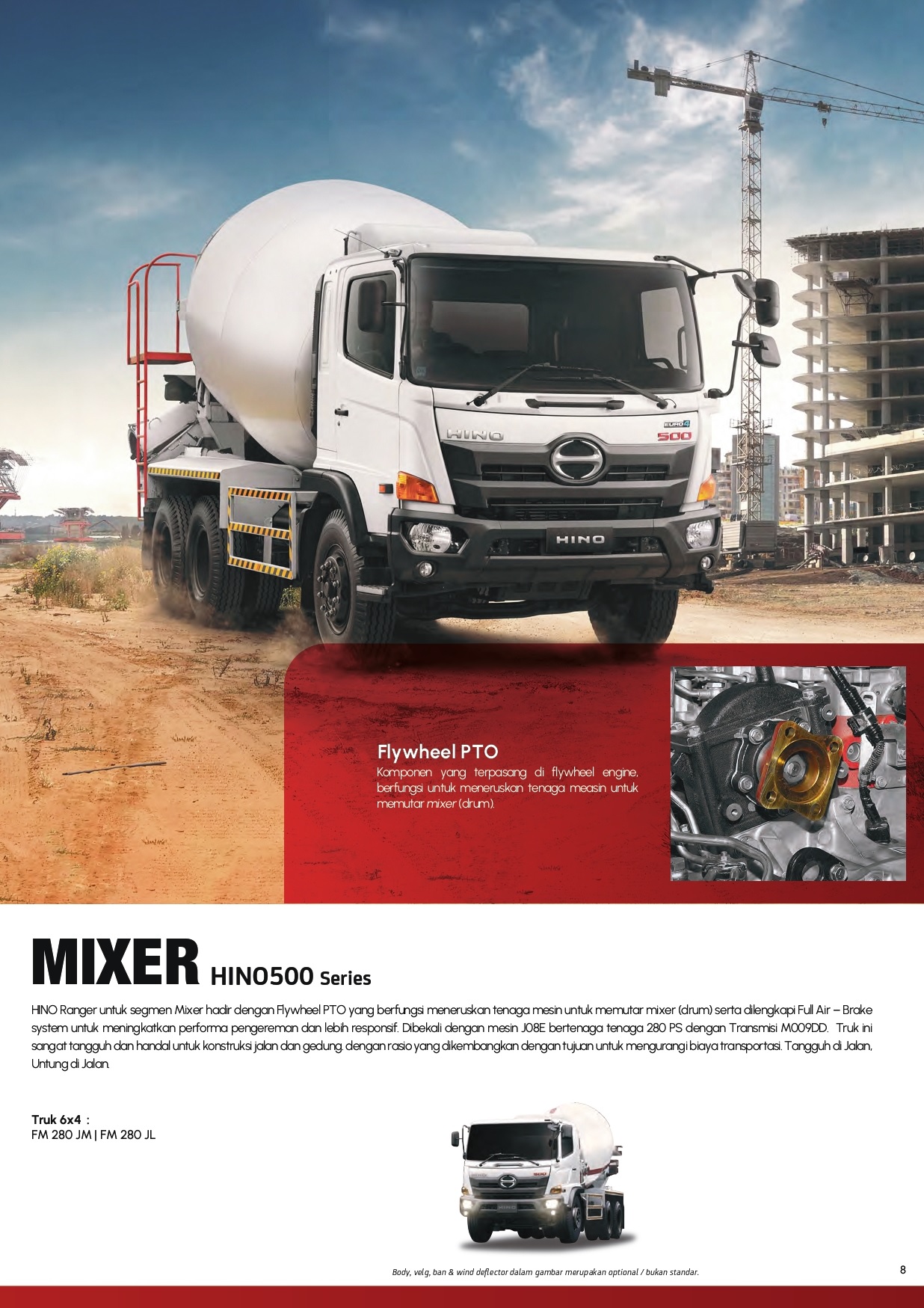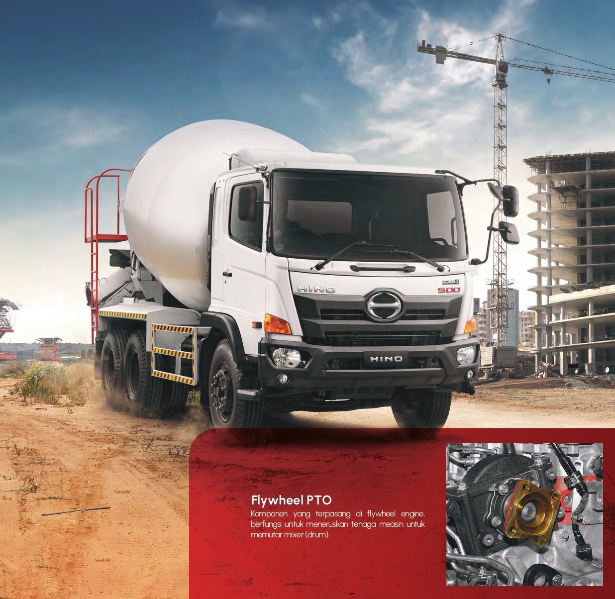 HINO Ranger untuk segmen Mixer hadir dengan Flywheel PTO yang berfungsi meneruskan tenaga mesin untuk memutar mixer (drum) serta dilengkapi Full Air–Brake system untuk meningkatkan performa pengereman dan lebih responsif. Dibekali dengan mesin JO8E bertenaga 280 PS dengan Transmisi M009DD. Truk ini sangat tangguh dan handal untuk konstruksi jalan dan gedung, dengan rasio yang dikembangkan dengan tujuan untuk mengurangi biaya transportasi.